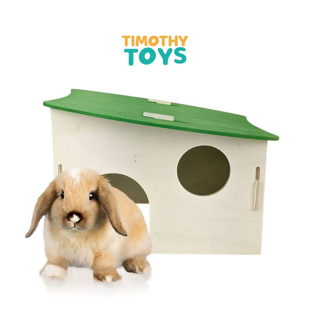 Casa de madera para conejos o pequeñas mascotas de 40x20x21 cm de Timothy Toys, diseñada para proporcionar un espacio amplio, seguro y resistente. Ideal para uso en interiores o áreas protegidas en exteriores.